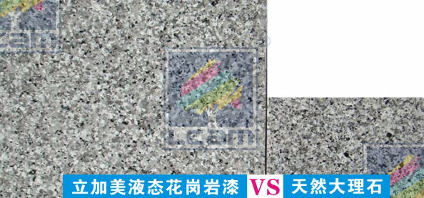 立加美高端花彩漆又称液态花岗岩漆、水包水、多彩涂料与天然真石漆、花岗岩石漆、质感漆、砂胶漆等砂壁状品种比较,在本质上和状态上具有完全不同的概念即,是以物理化学的胶体技术和表面处理技术为基础,融入了物质的物理变化及化学反应的多项转化,将液态的水性树脂提炼包裹成胶状的水性彩色颗粒,并均匀地悬浮在特定的水性乳胶中,最终形成了多姿多彩的、颗粒大小随意的高分子液态胶状的共聚物。它不但具有普通建筑涂料的所有特性,更具有极强的耐候性、抗龟裂性和环保性以及仿花岗石等特性。特别是其模仿花岗石的效果已达炉火纯青、真假难辨的地步。该技术既源于建筑涂料的合成理念,但又超越了建筑涂料的认知概念,是建筑涂料的一项重大创新应用产品。