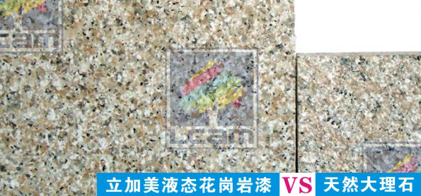 立加美高端花彩漆又称液态花岗岩漆、水包水、多彩涂料与天然真石漆、花岗岩石漆、质感漆、砂胶漆等砂壁状品种比较,在本质上和状态上具有完全不同的概念即,是以物理化学的胶体技术和表面处理技术为基础,融入了物质的物理变化及化学反应的多项转化,将液态的水性树脂提炼包裹成胶状的水性彩色颗粒,并均匀地悬浮在特定的水性乳胶中,最终形成了多姿多彩的、颗粒大小随意的高分子液态胶状的共聚物。它不但具有普通建筑涂料的所有特性,更具有极强的耐候性、抗龟裂性和环保性以及仿花岗石等特性。特别是其模仿花岗石的效果已达炉火纯青、真假难辨的地步。该技术既源于建筑涂料的合成理念,但又超越了建筑涂料的认知概念,是建筑涂料的一项重大创新应用产品。