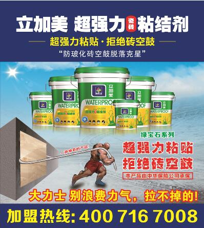 立加美超强力瓷砖粘结剂是目前国际上最先进的无添加纳米技术,采用多元进口优质高分子乳液、精选名牌助剂等进行特殊工艺改性复合而成,不含APEO和甲醛的环保产品。是“防玻化砖脱落的克星”,专门应用于玻化砖的背面处理,有效提高玻化砖与粘结材料之间的粘结强度,解决玻化砖粘贴中常见的空鼓、脱落问题。也适用于低吸水率、质地致密、表面光滑的石材及其它砖材的背面处理,粘结强度高、柔韧性优异,具有特别超强的粘结作用,是玻化砖、石材等材料的粘贴首选产品。