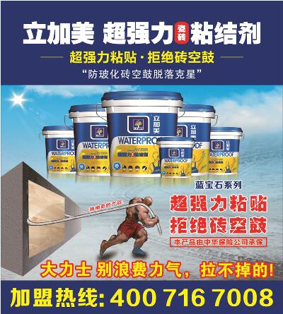 立加美超强力瓷砖粘结剂是目前国际上最先进的无添加纳米技术,采用多元进口优质高分子乳液、精选名牌助剂等进行特殊工艺改性复合而成,不含APEO和甲醛的环保产品。是“防玻化砖脱落的克星”,专门应用于玻化砖的背面处理,有效提高玻化砖与粘结材料之间的粘结强度,解决玻化砖粘贴中常见的空鼓、脱落问题。也适用于低吸水率、质地致密、表面光滑的石材及其它砖材的背面处理,粘结强度高、柔韧性优异,具有特别超强的粘结作用,是玻化砖、石材等材料的粘贴首选产品。